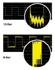 | В 16 РАЗ БОЛЬШЕ РАЗРЕШЕНИЕ Разрешение 12-битного АЦП в 16 раз лучше по сравнению с 8-битным АЦП. 4096 уровня дискретизации снижают ошибку квантования и улучшают точность измерения напряжения. Разница в точности измерения и отображения сигнала показана на рисунках ниже. Использование АЦП с более низким разрешением приводит к увеличению ошибки квантования, использование АЦП с высоким разрешением снижает ошибку квантования и позволяет более точно отобразить форму захваченного сигнала. |