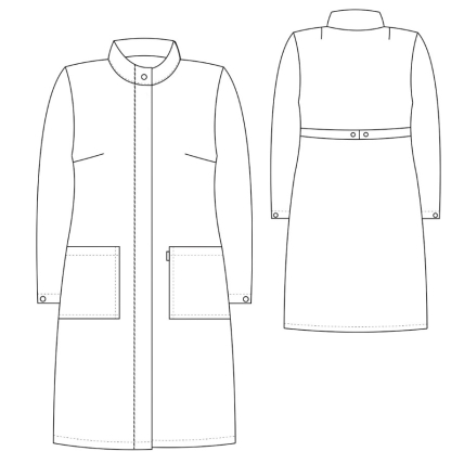 Спинка с плечевыми вытачками, по линии талии находится пояс-хлястик застегивающийся на 2 кнопки для регулирования обхвата талии.