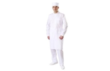 Этот халат рекомендовано носить в условиях чистых помещений, которые соответствуют 6 и ниже классу ISO. Модель имеет прямой фасон. Основной борт застегивается на кнопки. Цельный перед дополнен тремя карманами в разных частях. На спинке присутствует кокетка, из-под которой идут складки. На тили находится хлястик с кнопочной застежкой. Воротник стойкой дополнен вешалкой с внутренней стороны.