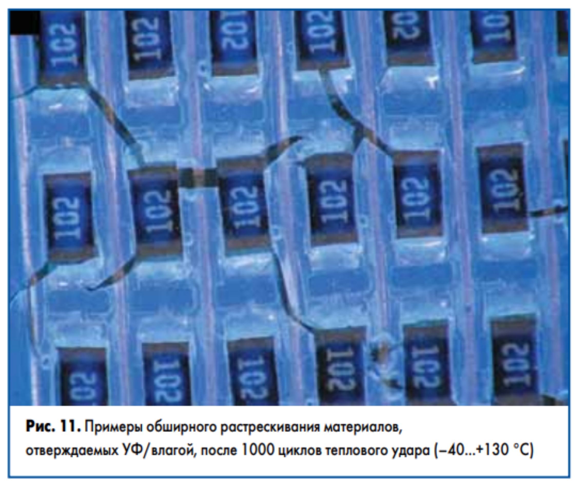Помимо указанных значений модуля упру‑ гости и относительного удлинения, не менее важными являются значения коэффициента теплового расширения (CTE) и температуры стеклования (Tg). Разница между CTE всего паяного узла (5–15 частей на миллион) и покрытия (больше нескольких сотен ч/млн) становится одной из причин растрескивания покрытия во время испытаний на термический удар.