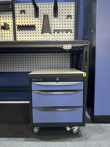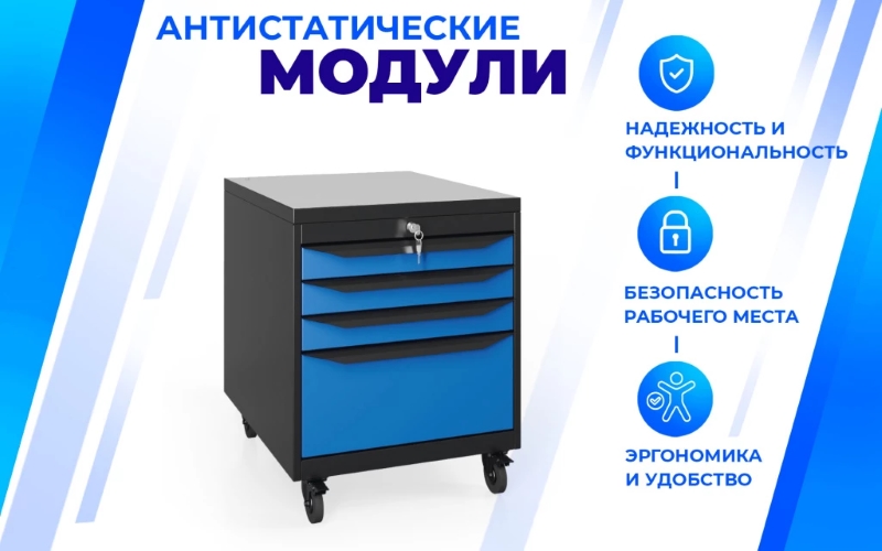 Все элементы корпуса покрыты электропроводящей антистатической краской, которая обеспечивает электропроводность. Сверху модуля установлена антистатическая столешница. Модуль оснащен четырьмя колесами, система обеспечивает эффективное заземление для снижения статического заряда и предотвращения его передачи на другие поверхности. Подкатные антистатические модули широко применяются в различных отраслях, где статическое электричество может вызывать проблемы, например, в производстве электроники, печати и упаковке. Окраска элементов корпуса осуществляется порошковой антистатической краской: RAL 9011 (темный графит), дверцы RAL 5023 (синий), столешница RAL 7047 (серый).
