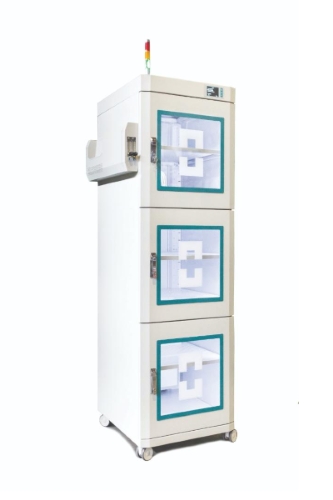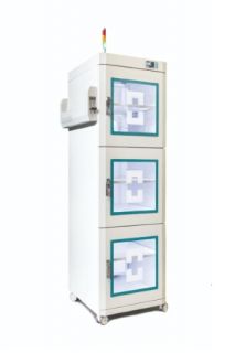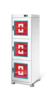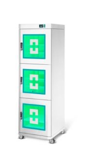 В стандартной комплектации шкаф оснащен тремя отделениями с независимыми замками, индикаторами температуры и влажности в камере и четырьмя антистатическими поворотными колесами.