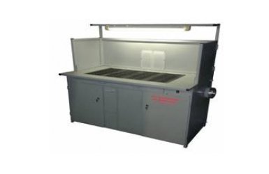 Стол сварщика предназначен для сварочных работ, стол имеет особенность удаление вредных паров при помощи вытяжного устройство – вентилятора. Едкий дым удаляется через чугунные решетки расположенные на столешнице, так же удаление происходит через защитный экран. На защитном экране установлена лампа дневного света. В столе сварщика предусмотрен колчан для электродов, дверь распашная с двумя полками под инструмент, ящик под окалины, дверь распашная на замке для доступа к вытяжной системе.