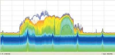 Расширенные режимы запуска, DPX со свипированием и с нулевой полосой обзора (опция 200) дают превосходные возможности анализа спектра переходных процессов. В данном случае выполняется свипирование спектра шириной 150 МГц в диапазоне ISM. Видно несколько сигналов WLAN, а узкополосные сигналы, отображаемые синей кривой с удержанием пиковых значений, являются тестовыми сигналами Bluetooth. Ниже уровня шумов анализатора на многоцветном дисплее DPX видны сигналы помех. |