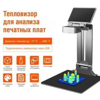 Тепловизор без экрана, для работы требуется ПК до управление WIN10/11 или смартфон на базе Android, подключение по интерфейсу USB Type-C. Предназначен для анализа тепловых изображений печатных плат. Детектирование паразитных токов в следствие плохого контакта или мест короткого замыкания. Дистанция измерения от 100 до 150 мм, при использовании макро линзы от 30 мм. Регулируемая по высоте вертикальная стойка с подставкой для смартфона, для удобного расположения на рабочем месте. Программное обеспечение с широким набором функций – 6 типов палитр, автоотслеживание горячих и холодных точек, установка допуска, сохранение фото (jpg) или запись видео файла (mp4).