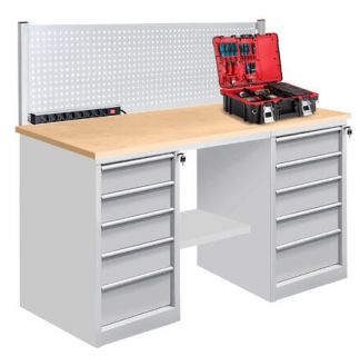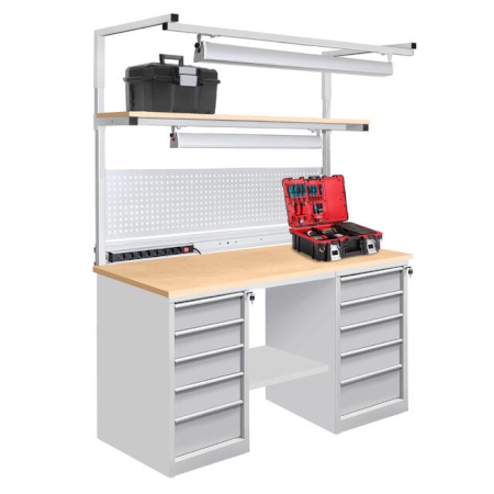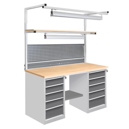 На тумбах установлен центральный замок для индивидуального доступа. Ручки изготовлены из алюминиевого профиля с анодированным покрытием и боковыми пазами для установки обозначения (маркировки) ящиков по их прямому назначению (подразделение организации, документация, инструменты, материалы и т.д.). В зависимости от габаритов используемых инструментов, материалов и оснастки возможно подобрать тумбу верстака с разным количеством ящиков. Нижняя полка верстака изготовлена из металла для устойчивого положения верстака и позволяет организовать хранение материалов.