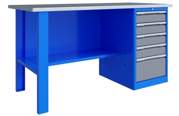 Верстак серии Technic 161.15.3 состоит из столешницы шириной 1596 мм, опоры, тумбы P5 с четырьмя малыми и одним большим ящиком и полки-стенки.
