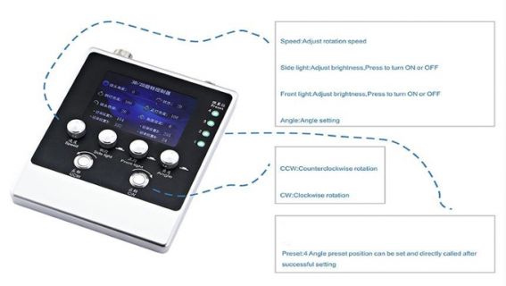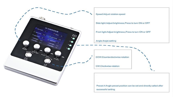 Регулировка яркости кольцевого осветителя и 3D подсветки. Выбор направления вращения. Регулировка скорости вращения. Выбор угла обзора. 4 программируемые ячейки с углом обзора. |