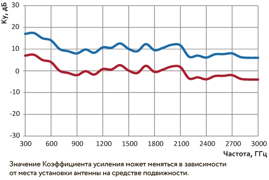 ** Значение Коэффициента усиления может меняться в зависимости от места установки антенны на средстве подвижности.